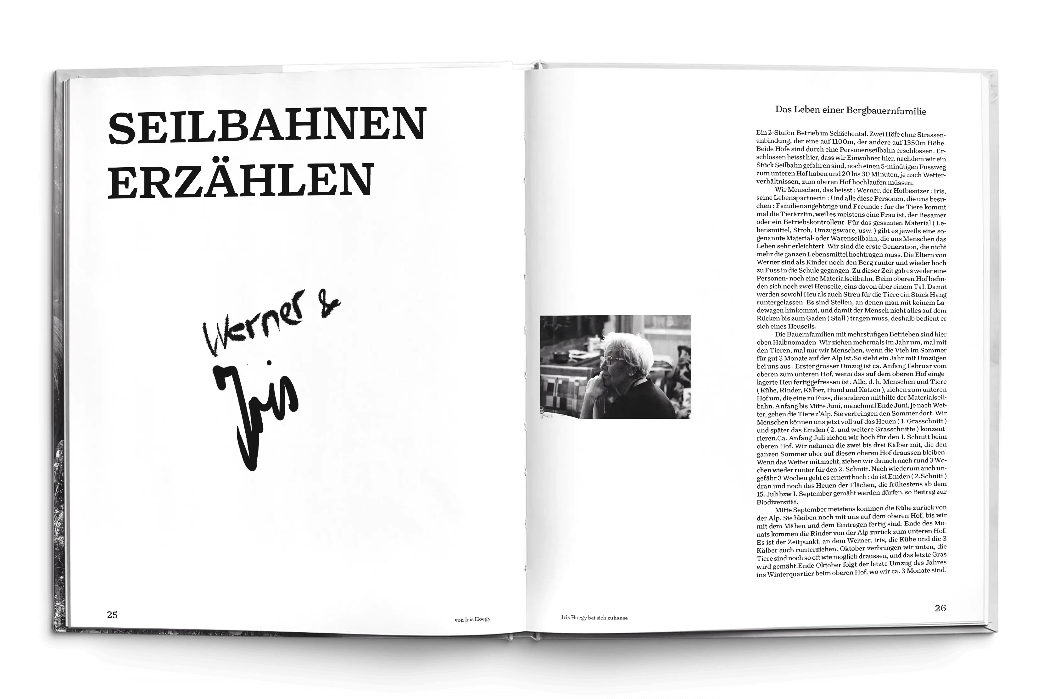 Auf Anfrage von Michel Roth, Musiker und Forscher an der FHNW, erstellten wir eine Publikation zu seiner Forschungsarbeit «Alpine Netzwerke der Verbundenheit». Er untersuchte die Klänge der Kleinseinbahnen im Schächental. Einwohner:innen des Schächentals verfassten Texte zu ihren Erfahrungen mit den Kleinseilbahnen oder gaben Interviews. Die Publikation sollte ein persönliches Porträt des Schächentals sein. Das Layout variiert je nach Textart. Die Interviews sind wie eine Seilbahn gelayoutet sie gehen rauf und runter; am Rand der Reportagen findet man persönliche Notizen. In der Buchmitte hat es eine Fotoreihe, welche eine Familie beim Alpaufzug und Alpabzug mithilfe der Kleinseilbahnen zeigt. Das finale Kapitel zeigt Michel Roth mit begleitenden QR-Codes für seine Tnaufnahmen, zu passenden Textabschnitten.